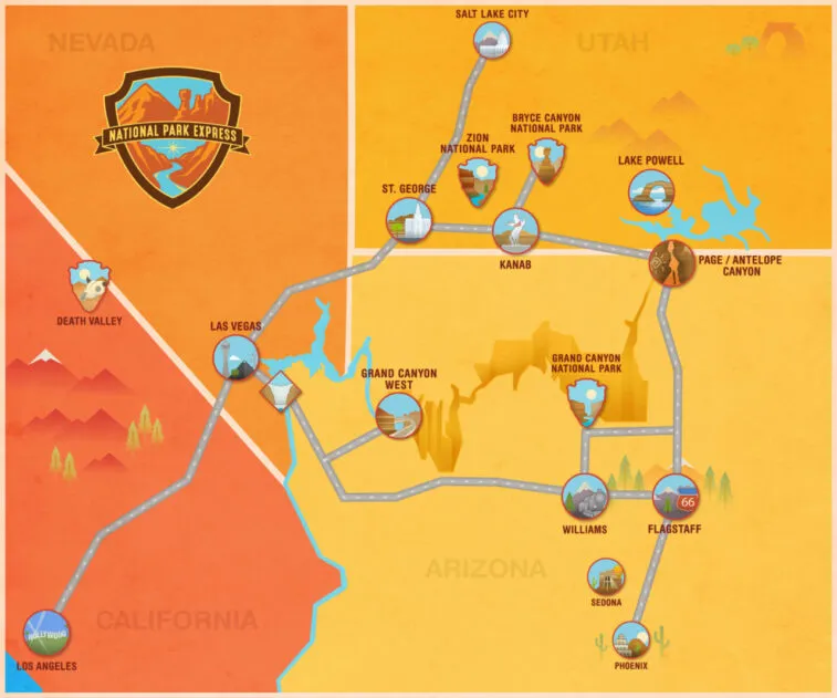 Discover the wonders beyond Vegas with our exceptional shuttle service. National Park Express welcomes you with open arms, providing comfortable journeys accompanied by awe-inspiring landscapes. Join us on board for an unforgettable journey to these iconic parks!